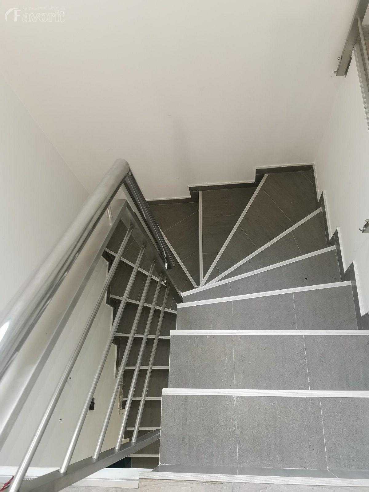 Prostor je organizovan u dva nivoa sa visinom plafona 3m i betonskim stepenistem koje vodi na drugi nivo.