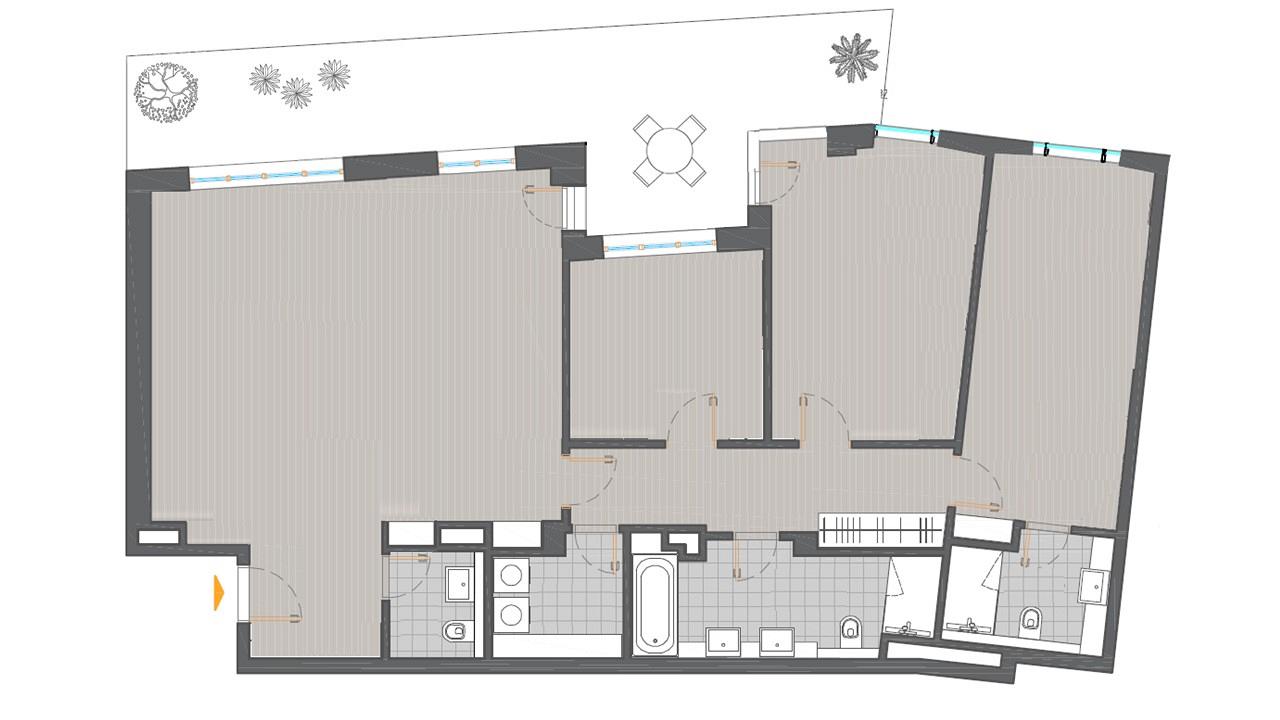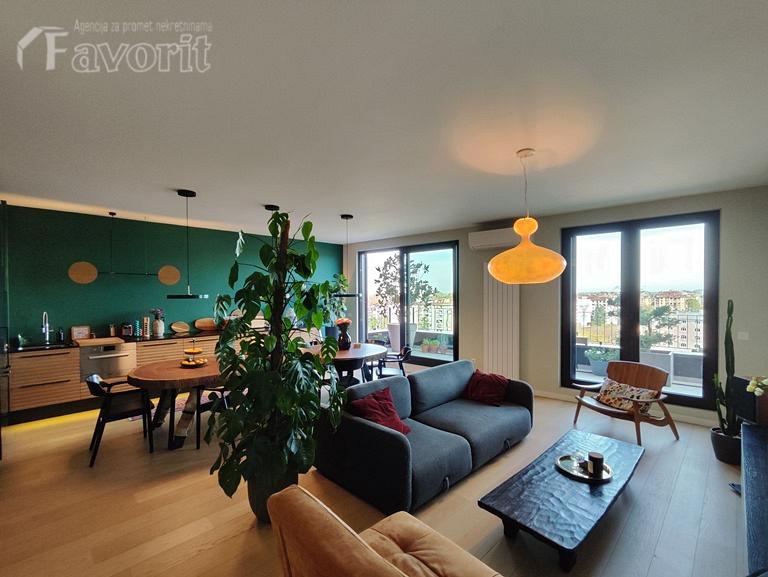 Stan je 4-soban, povrsine 152m2 (terasa 25m2). Sastoji se od prostranog dnevno-trpezarijsko-kuhinjskog dela, 3 spavace sobe, dva velika kupatila, gostinskog toaleta i veseraja. Stan je istocno orijentisan i gotovo celom duzinom izlazi na veliku terasu od 25m2.
