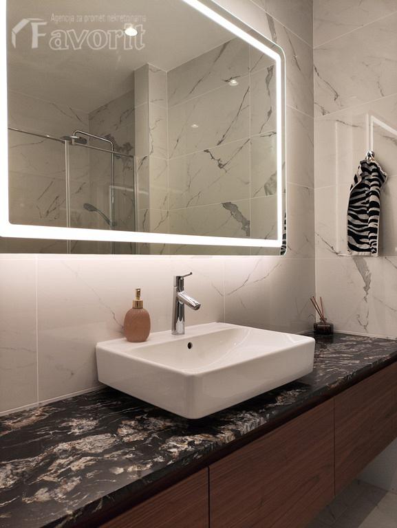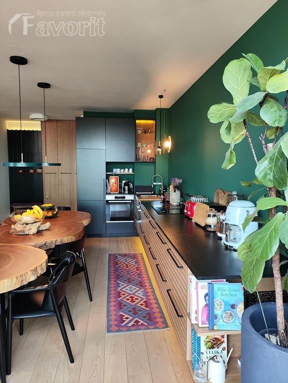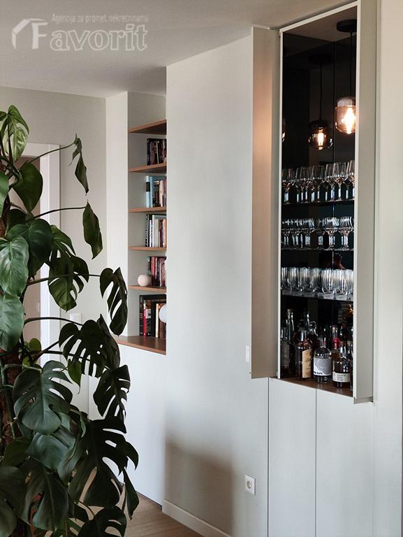 Prostor je izuzetno svetao, velikih staklenih povrsina, sa visinom plafona 2,80m. U enterijeru su korisceni veoma kvalitetni materijali i ugradna tehnika.
