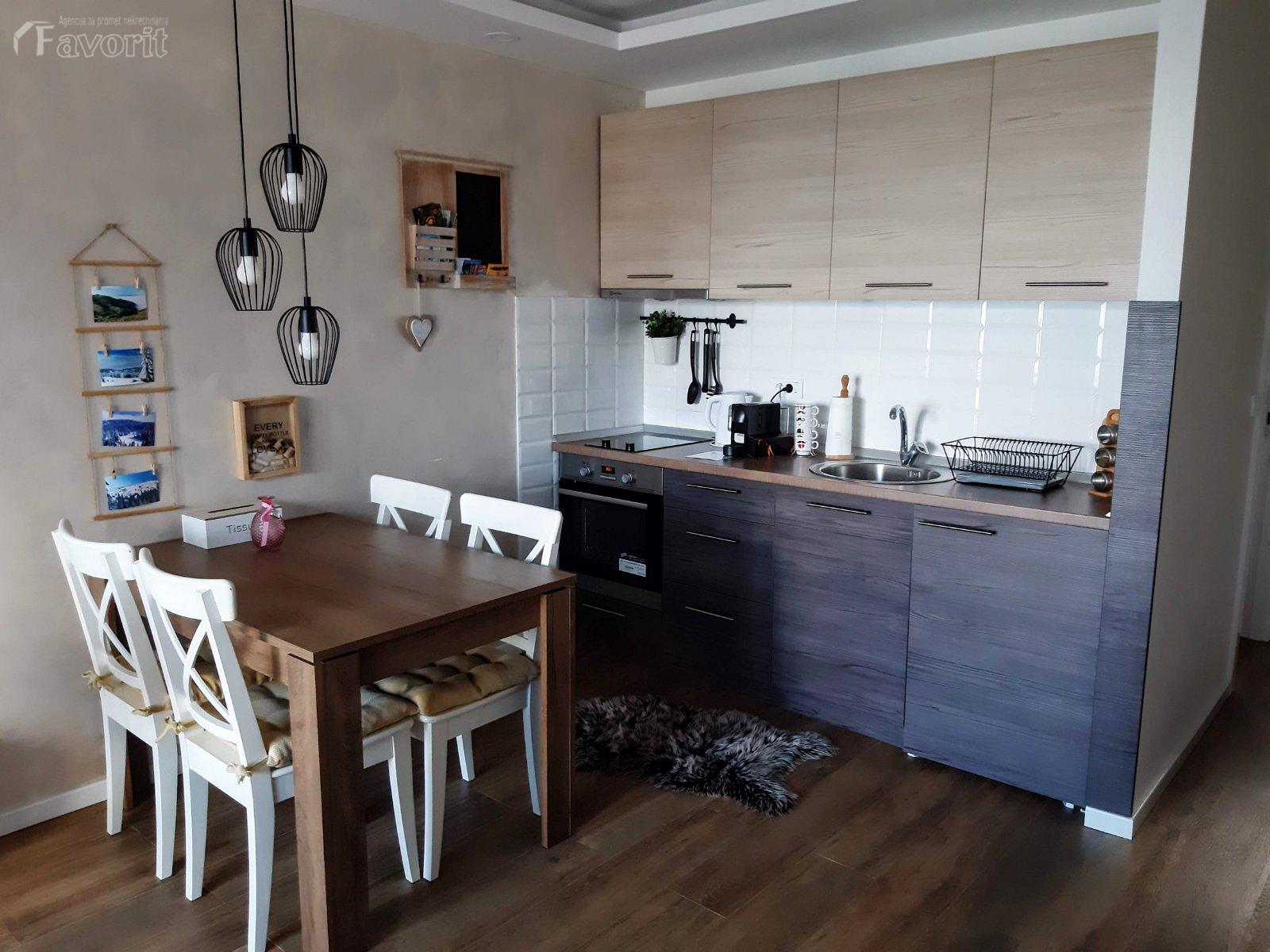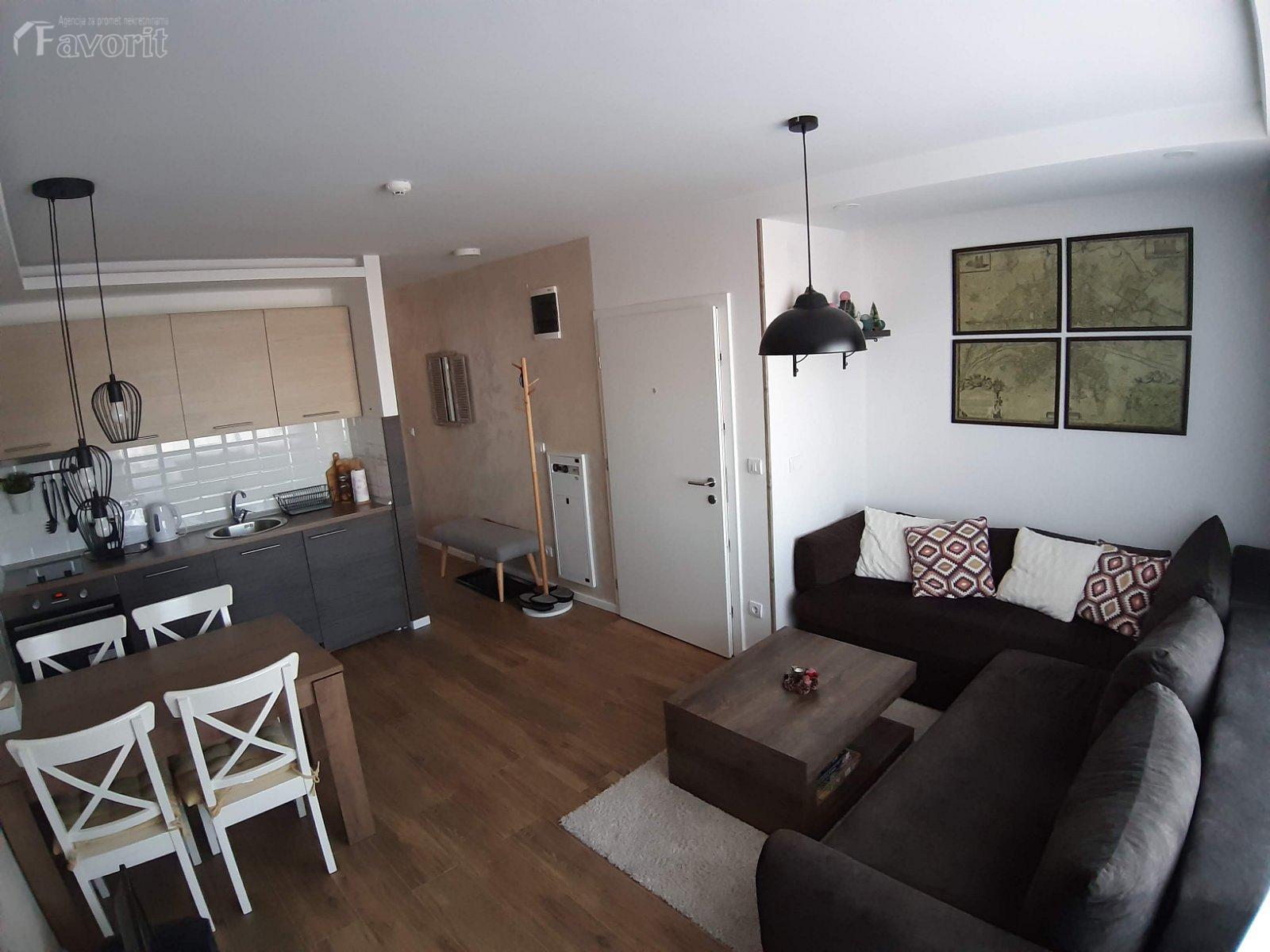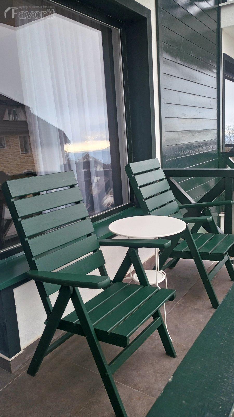 Sastoji se od dnevnog boravka po principu open space povezanog sa trpezarijom i kuhinjom, odvojene spavace sobe, kupatila i terase sa koje se pruza prelep pogled ka prirodi, za uzivanje. Obezbedjen parking za vlasnike apartmana.
